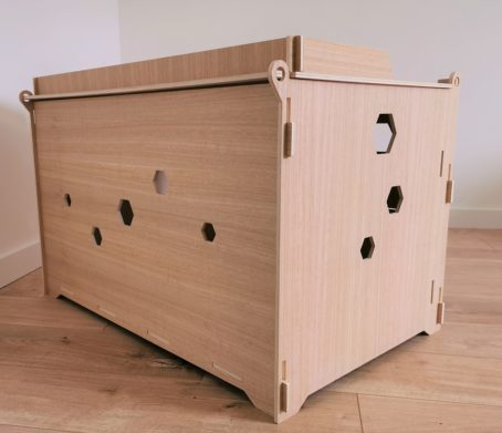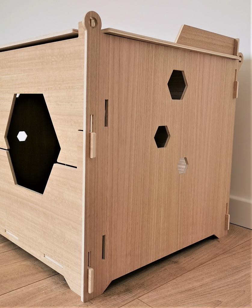 La maison de naissance ou caisse de mise bas pour chat « Hexagone » fait partie de la collection « Hexagone » de Côté Kube. Fabriquée artisanalement avec amour et souci du détail, cette caisse de mise bas est le fruit d’un savoir-faire traditionnel français. Son design élégant et épuré, inspiré par l’architecture et l’art moderne, se coordonne facilement avec tout type d’intérieur.